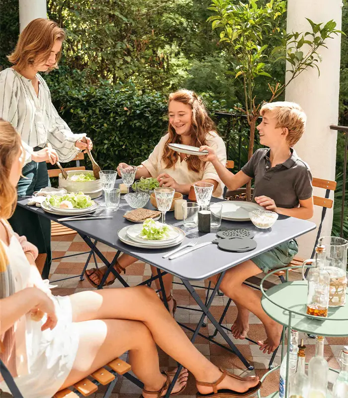 Bring a refined Parisian charm to your outdoor dining experience with the Bistro dining set, featuring the Bistro’s spacious folding table and the beautifully crafted Bistro Natural chairs. Designed for up to six guests, this set blends timeless elegance with everyday functionality. The table’s generous size makes it ideal for lively gatherings, while the natural beech and metal pairing of the chairs adds warmth and authenticity to any setting. With folding practicality, weather-resistant finishes, and a palette of stylish colors, this French-made ensemble is perfect for terraces, gardens, and balconies alike. A true celebration of Fermob’s heritage—where classic design meets modern comfort.