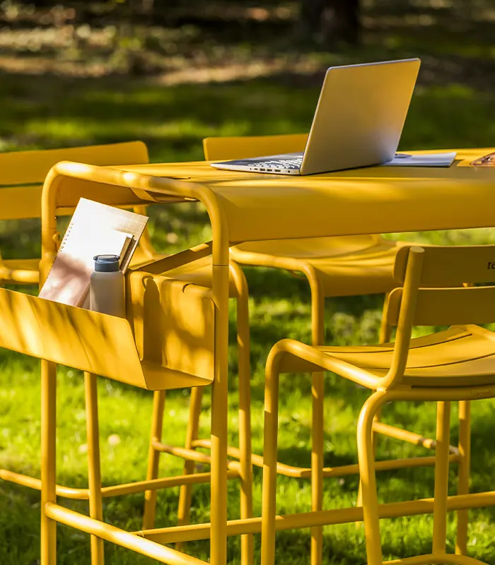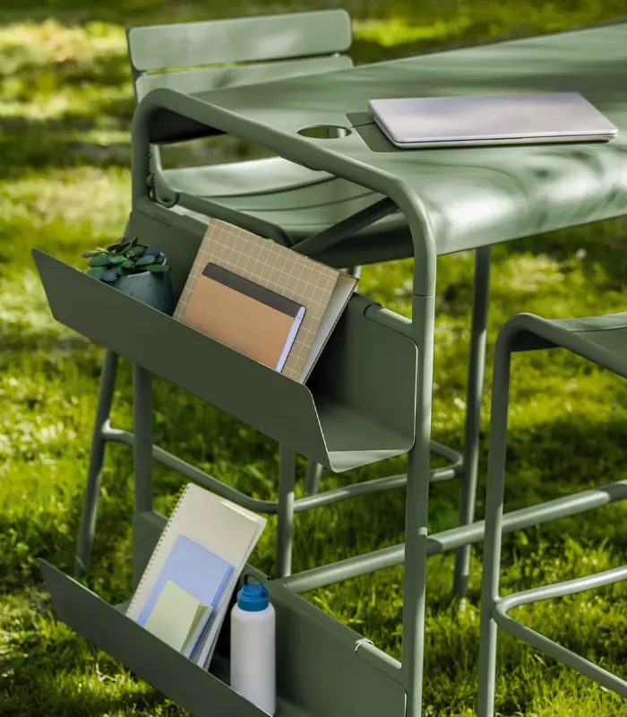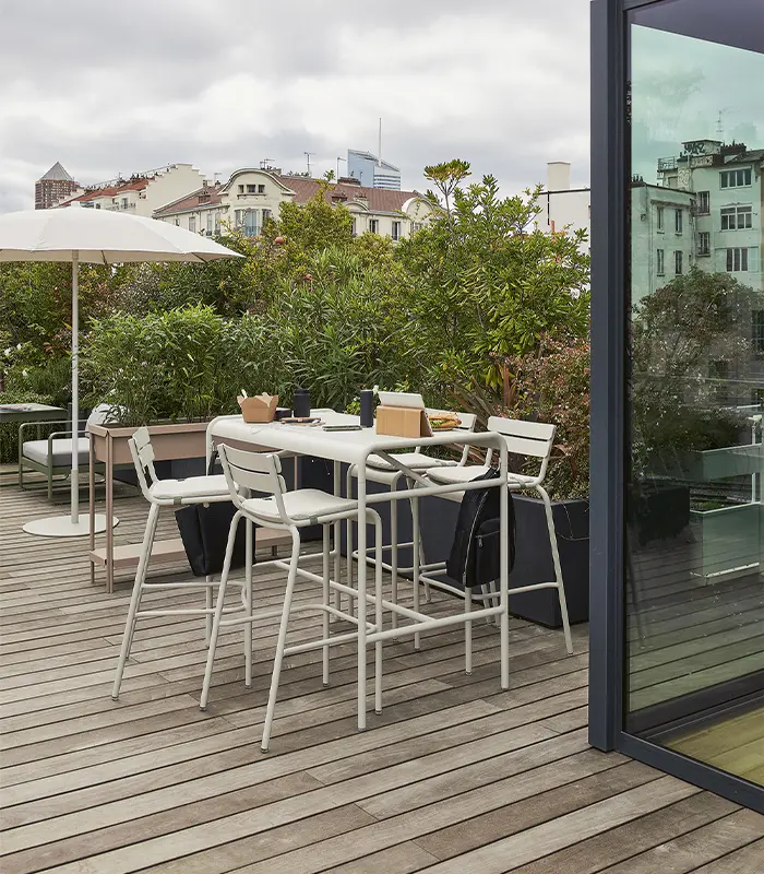 Elevate your outdoor gatherings with the Luxembourg High Dining Set—designed for comfort, style, and sociability. The sleek aluminium high table comfortably seats 4 to 6 people and features clever details like handy hooks for bags or jackets, making it perfect for spontaneous drinks or relaxed meals. Paired with the matching high Luxembourg stools, these stackable, weather-resistant chairs bring the classic charm of the collection to a new height. Available in 22 vibrant colors, this set adapts effortlessly to any terrace, garden, or indoor space with an industrial vibe, combining durability with timeless elegance.