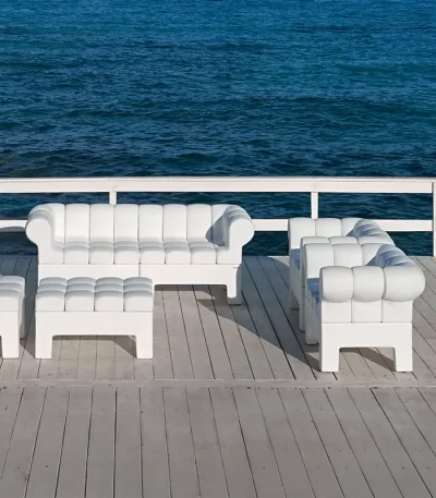 The Modì Sofas offer modular seating that transforms to fit any outdoor space with ease. Made up of individual upholstered modules that slot into a rectangular Poleasy® base, these sofas provide comfort and style, with a design that recalls classic quilting. The seats are covered in eco-leather for outdoor use, ensuring both durability and luxury. With its adaptable configuration and modern design, the Modì Sofa allows you to create the perfect seating arrangement for your outdoor space.