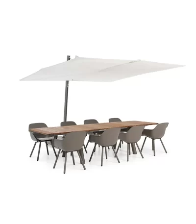 Pair it with Captain’s Pipe Chairs for long, relaxed dinners, or keep it minimal with sleek benches and add cushions or BYOS backrests for extra comfort. And for sunny days? The Sensu parasol keeps everyone cool — no awkward pole placements, just seamless shade.