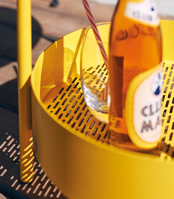 The Salsa side table, designed by the Spanish studio Goula & Figuera, is a stylish, modern piece inspired by the Bauhaus and modernist movements. With its sleek, geometric design and three-legged structure, it combines elegance and practicality in one small, versatile table. Perfect for use as an occasional table, side bar, or mini-bar, the Salsa table features a clever perforated basket for storage and water drainage, making it ideal for both indoor and outdoor settings. Its lightweight build, stability and weather-resistant coating ensure it’s a functional and attractive addition to any space, whether on the terrace or in your lounge