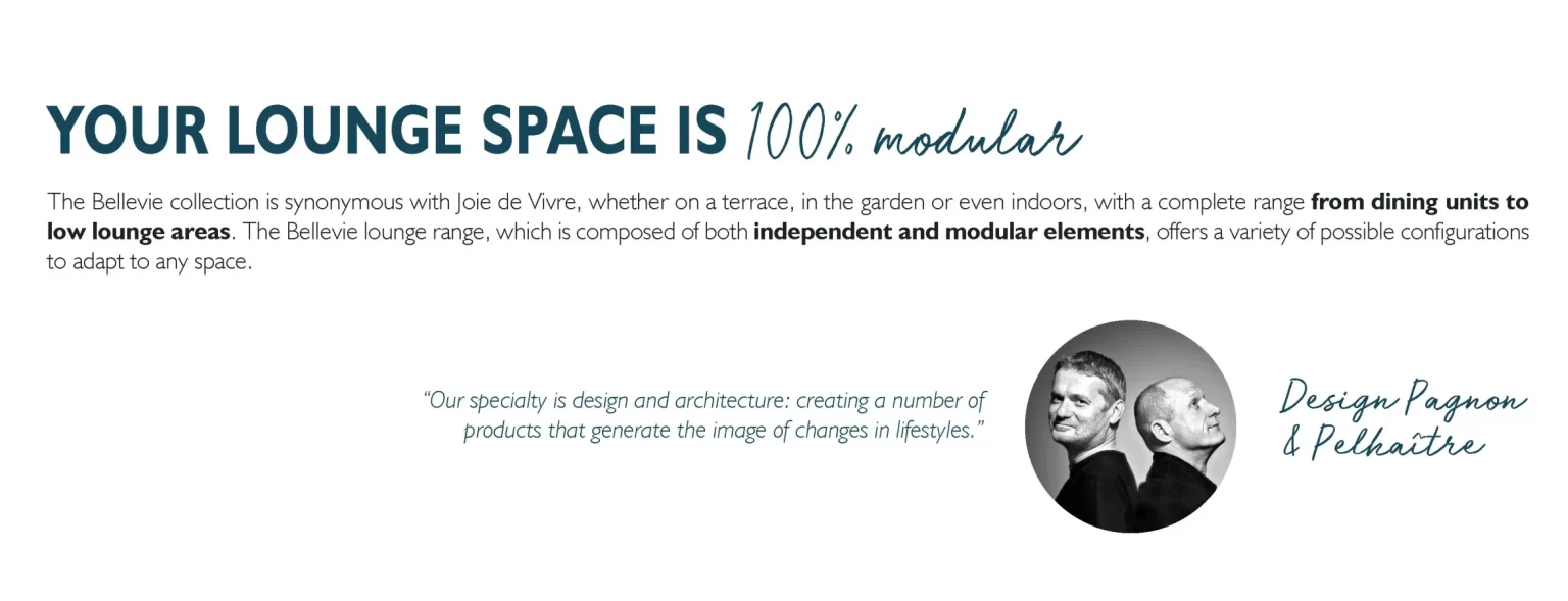 Made of aluminium, Bellevie is the perfect fit for outdoor use, and in case you still doubt it, this collection has been treated with very high protection for metal finishing. Thus, enabling them to face the harsh weather. Besides, this lightweight designer aluminium collection is ideal for the whole family: it’s perfect chatting peacefully, sharing secrets, relaxing side by side, or to be used in an improvised office space.