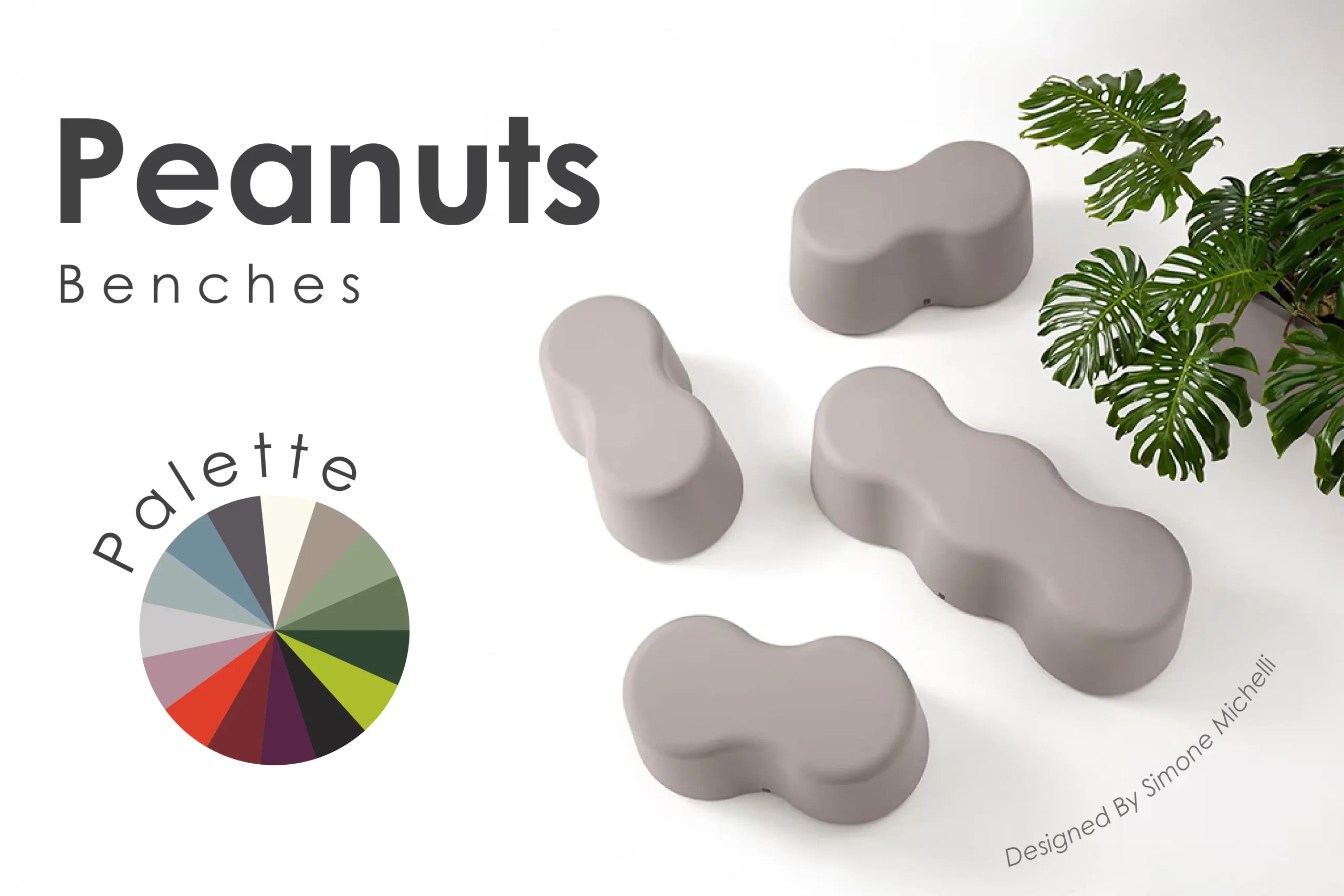 Designed by Simone Micheli Peanuts are multi-colored, wavy-shaped benches designed to bring vibrance and character to both indoor and outdoor spaces. Their sinuous and playful form not only introduces dynamic visual effect but also ensures comfort and functionality—ideal for informal gatherings, shared relaxation, and creative spatial arrangements.