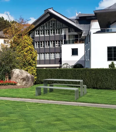 The 015 is a modular picnic table which connects tables and benches with lightweight linking plates, offering quick usability and eliminating seating obstacles.