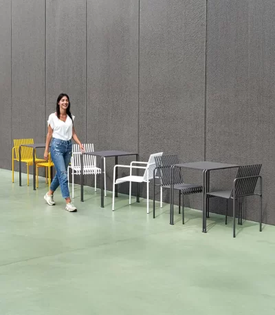 Introducing a versatile and refined set featuring a stackable contract table and the Amalfi chair from the Zeroquindici.015 family. The table, with its aluminum squared top and light tubular legs, offers a sleek, modern design that effortlessly combines form and function. Its simplicity allows for easy pairing with .015 Amalfi chair creating a seamless aesthetic. The Amalfi chair, available in versions with and without armrests, showcases virtuous lines that interact with simple, archetypal shapes. Inspired by Germanic design principles and crafted with Italy’s renowned industrial expertise, this set blends timeless elegance with practical design.
